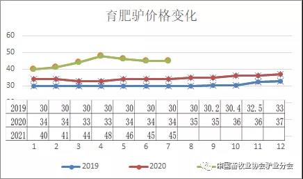 受到育肥驢價格帶動,驢駒價格6月份達(dá)到52元/KG,比年初上漲33.3%,比去年同期上漲57%,7月份小幅回落至46元/KG。