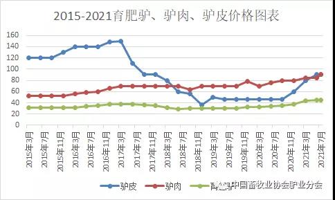 2021年1-4月份活驢價格延續(xù)2020年年末走勢繼續(xù)上升,創(chuàng)出歷史新高,每年5-8月份是傳統(tǒng)驢肉消費淡季,活驢價格出現(xiàn)季節(jié)性小幅回落,而驢肉、驢皮、阿膠價格不斷創(chuàng)出新高,在6月以后沒有出現(xiàn)回落現(xiàn)象。