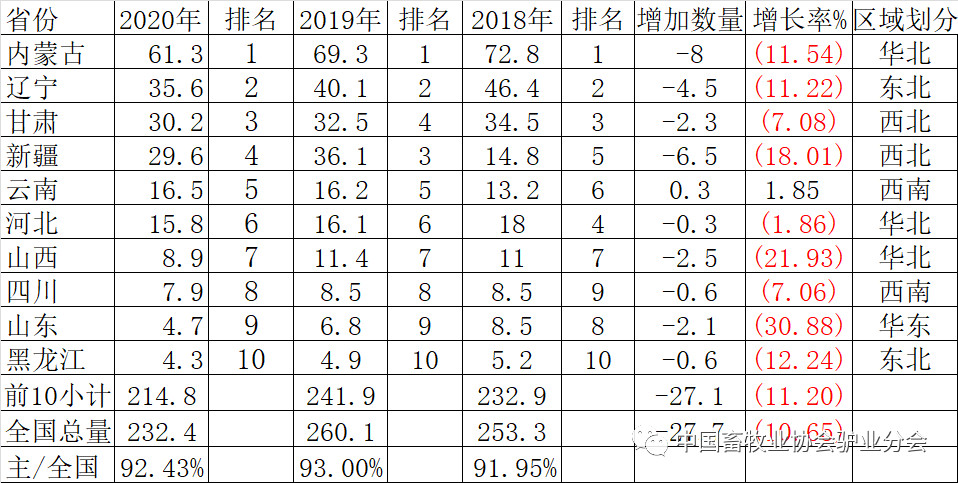 在地區(qū)分布方面,2020年全國(guó)驢存欄量排在前十的省(區(qū))整體未變,僅甘肅與新疆名次略有移動(dòng)。絕對(duì)數(shù)量方面,減少數(shù)量最多的三個(gè)省(區(qū))是內(nèi)蒙古、遼寧和新疆;相對(duì)來(lái)看,山東、山西、新疆三個(gè)省(區(qū))降幅最大。但值得注意的現(xiàn)象是,在存欄量總體下降趨勢(shì)下,云南省卻連續(xù)4年保持小幅增長(zhǎng)。