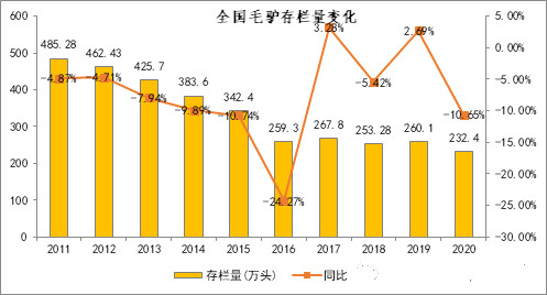 圖1 2011~2020年中國(guó)驢存欄數(shù)量及消長(zhǎng)變化