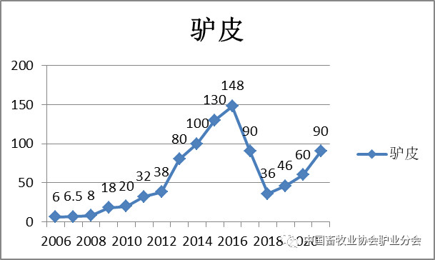 總體來(lái)說(shuō),2007~2017年育肥驢、母驢、驢肉、驢皮、阿膠價(jià)格均呈增長(zhǎng)態(tài)勢(shì),驢產(chǎn)品價(jià)格在2017年達(dá)到峰值,2017年5月開(kāi)始下跌,2019年下半年價(jià)格止跌回升,進(jìn)入2021年,一直維持在相對(duì)高位。