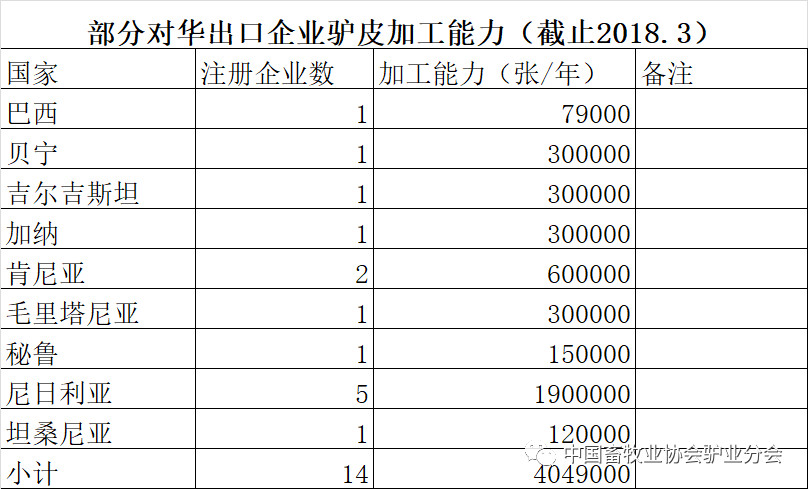 表1 部分對華出口國企業(yè)驢皮加工能力(截止2018.3)