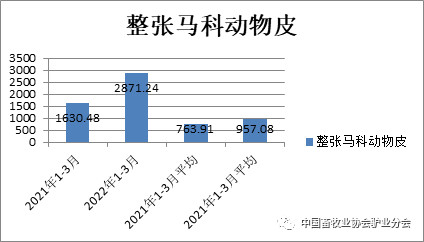 a.未剖層的整張馬科動物皮,2022年1-3月進(jìn)口2871.24噸,金額106638962元,單價37.14元/kg,一季度平均每月進(jìn)口957.08噸;2021年1-3月進(jìn)口1630.48噸,金額42116949元,單價25.83元,2021年一季度平均每月進(jìn)口543.49噸,全年平均每月進(jìn)口763.91噸。1-3月份進(jìn)口量同比增加76.1%。