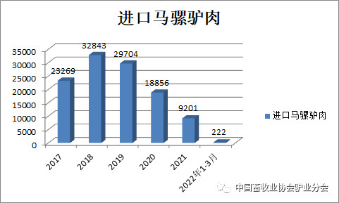 2022年1-3月進(jìn)口馬驢騾肉222噸,平均每月74噸,進(jìn)口驢肉平均到岸價格16.56元/kg。因防疫需要,從2021年下半年暫時停止從蒙古進(jìn)口,只從巴西進(jìn)口。如疫情繼續(xù)影響進(jìn)口,2022年馬騾驢肉進(jìn)口量將創(chuàng)近6年新低(2017年23 269噸,2018年32843噸、2019年29 704噸、2020年18856噸、2021年9 201噸)。