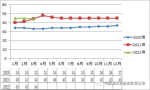 2021年一季度從1月份40元/kg上升到44元/kg,2022 年一季度從1月45元/kg降到3月份44元,預(yù)計2季度肉驢價格維持在44元/kg附近高位。