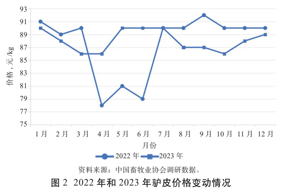 2023年全年驢皮價(jià)格小幅波動(dòng)。5—7月驢皮達(dá)最高價(jià)格,為90元/kg,其余時(shí)間在86~90元/kg波動(dòng)變化(圖2)。驢皮價(jià)格在1—3月呈現(xiàn)逐漸下降趨勢(shì);受活驢價(jià)格上漲拉動(dòng),4月份驢皮價(jià)格增長(zhǎng)至90元/kg,并維持該價(jià)格直至7月。下半年驢皮價(jià)格先是小幅下跌,在10月份觸底反彈,并在12月回升至89元/kg。冬季驢皮品質(zhì)較高,且具“食療冬補(bǔ)”特效,導(dǎo)致其需求上升,價(jià)格上漲。相較于往年,2023年的驢皮價(jià)格總體比較穩(wěn)定。近年來(lái),驢皮價(jià)格波動(dòng)十分劇烈,從2017年頂峰的160元/kg暴跌至2020年的40~50元/kg,隨后于2021年開始回升并維持在90元/kg左右[3]。隨著新冠肺炎疫情影響的減弱,驢皮價(jià)格隨著阿膠產(chǎn)業(yè)的逐步恢復(fù)而開始回升。我國(guó)驢皮供給量不足全球總供給量的1/4,國(guó)內(nèi)主要依靠進(jìn)口[4]。2021年以后,隨著驢皮進(jìn)口數(shù)量增加,驢皮價(jià)格在一定程度上開始回落。整體看來(lái),驢皮對(duì)國(guó)外進(jìn)口依賴度高,價(jià)格不確定性大,未來(lái)我國(guó)驢皮價(jià)格依然存在著波動(dòng)的挑戰(zhàn)。