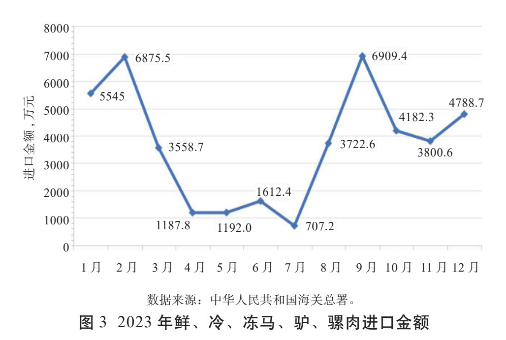 此外,我國(guó)驢業(yè)面臨的進(jìn)口沖擊不容小覷。2023年我國(guó)鮮、冷、凍馬、驢、騾進(jìn)口總金額約為4.41億元,較上年增長(zhǎng)了184.5%。進(jìn)口的大幅增加與國(guó)內(nèi)市場(chǎng)供需失衡情況有關(guān),隨著市場(chǎng)回暖,驢業(yè)需求增加但存欄量不增反減,需要通過進(jìn)口滿足市場(chǎng)需求。據(jù)統(tǒng)計(jì),目前國(guó)內(nèi)驢肉產(chǎn)量只能滿足國(guó)內(nèi)需求量的20%~30%,其余部分需要通過進(jìn)口彌補(bǔ)。全年范圍內(nèi),進(jìn)口金額呈現(xiàn)波動(dòng)狀態(tài)。具體來(lái)看,2月和9月進(jìn)口額最高,分別達(dá)到了6 875.5萬(wàn)元、6 909.4萬(wàn)元(圖3);4—7月出現(xiàn)了短期低迷情況,7月份進(jìn)口金額達(dá)到最低點(diǎn)707.2萬(wàn)元,春夏交際期間,國(guó)內(nèi)活驢供給相對(duì)充足,進(jìn)口量相對(duì)減少。我國(guó)驢存欄量逐年減少,供給嚴(yán)重依靠國(guó)外進(jìn)口,進(jìn)口額的波動(dòng)對(duì)國(guó)內(nèi)市場(chǎng)造成了一定的不確定性[5]??傮w來(lái)看,由于國(guó)內(nèi)供給能力不足,國(guó)內(nèi)驢存欄量持續(xù)下降,在未來(lái)一段時(shí)間,驢業(yè)面臨的進(jìn)口沖擊將依然存在。