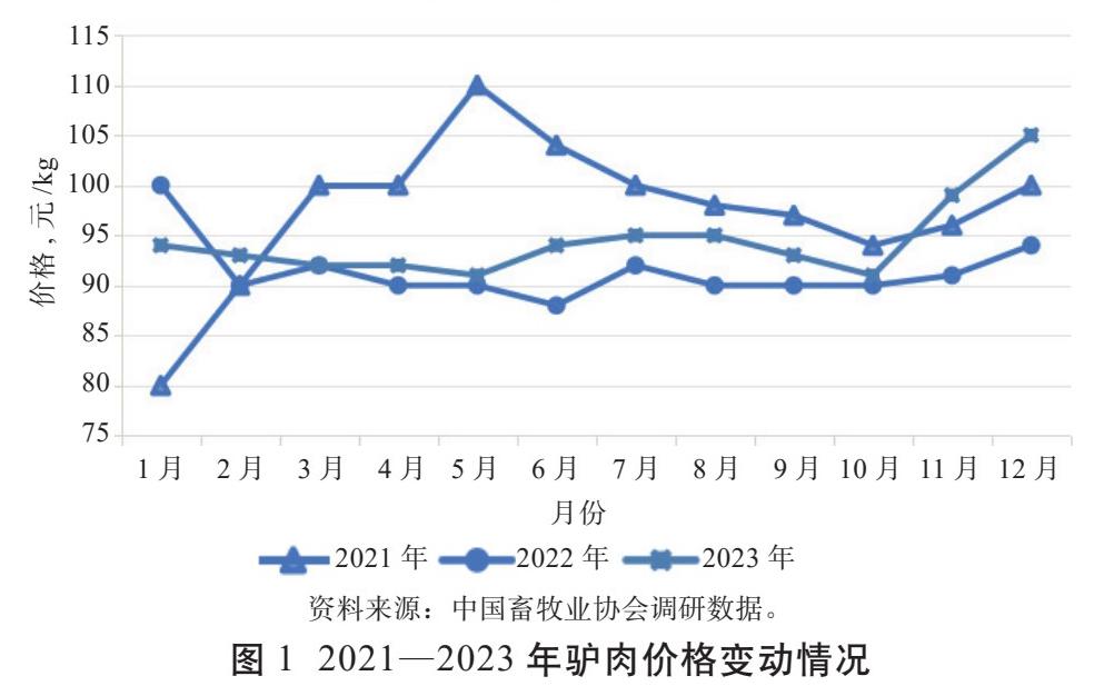 2023年驢肉價(jià)格整體上呈現(xiàn)前期小幅波動(dòng)、后期大幅增長(zhǎng)態(tài)勢(shì)(圖1)。年初由于國(guó)內(nèi)經(jīng)濟(jì)復(fù)蘇,驢肉市場(chǎng)供給恢復(fù),驢肉價(jià)格有所下降。1—5月,驢肉價(jià)格呈現(xiàn)逐漸下降趨勢(shì);6—10月,驢肉價(jià)格出現(xiàn)小幅波動(dòng),在此期間,最低價(jià)為91元/kg,最高價(jià)為9元/kg;10—12月,驢肉價(jià)格大幅上漲,最高達(dá)到105元/kg。驢肉消費(fèi)具有季節(jié)性特征,年末驢肉價(jià)格上漲與該時(shí)期驢肉飲食需求增加有關(guān)[2]。驢肉價(jià)格受國(guó)內(nèi)餐飲影響較大。隨著我國(guó)飲食結(jié)構(gòu)的多元化發(fā)展,未來(lái)一段時(shí)間內(nèi),預(yù)計(jì)驢肉價(jià)格將持續(xù)上漲。