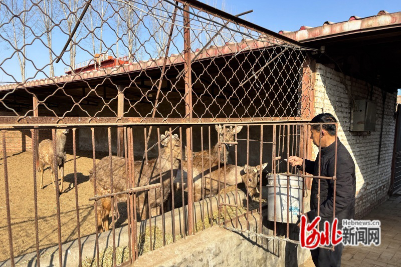 圖為遷西縣三屯營鎮(zhèn)龐鐵梅花鹿養(yǎng)殖場負責人正在給梅花鹿加草料。王連營攝