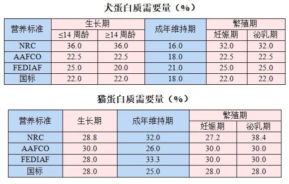 我國寵物食品生產和研發(fā)中,參考以下標準來判斷犬貓蛋白質的需要,分別是NRC犬貓營養(yǎng)需要、美國飼料管理協(xié)會犬貓食品營養(yǎng)概況、歐洲寵物食品工業(yè)聯(lián)合會營養(yǎng)指南,以及國家標準?,F(xiàn)將數(shù)據(jù)匯總為以下兩個表格。