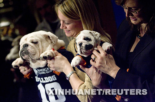 1月16日,在美國紐約舉行的新聞發(fā)布會(huì)上,工作人員展示兩只斗牛犬。新華社/路透