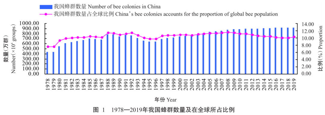 根據(jù)FAO數(shù)據(jù)統(tǒng)計,1978—2019年我國蜂群數(shù)量總體上呈上升趨勢。2019年我國蜂群數(shù)量達(dá)923.09萬群,占全球蜂群數(shù)量的10.24%,較1978年增長111.87%,年均增長率為1.85%。1978—1996年呈先增長后降低的變化趨勢,1996年后呈逐步增長趨勢,1996—2008年增長迅速,2009年后增長緩慢,趨于平穩(wěn)發(fā)展?fàn)顟B(tài);1978—2008年,我國蜂群數(shù)量在全球所占比例的變化趨勢與我國蜂群數(shù)量變化趨勢基本相似,2009—2019年,由于我國蜂群數(shù)量增長趨勢放緩,我國蜂群數(shù)量在全球所占比例呈下降趨勢。
