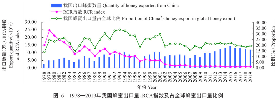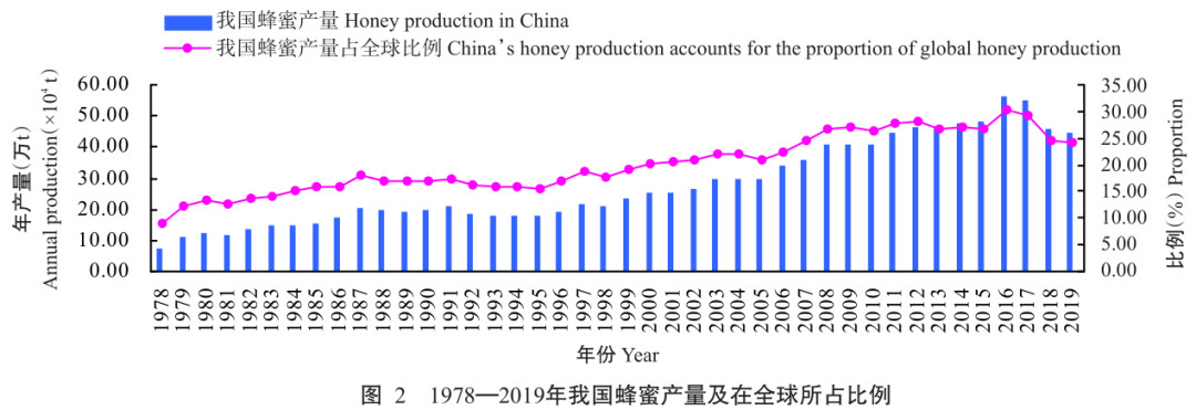 養(yǎng)蜂業(yè)是以人工飼養(yǎng)蜜蜂獲得蜜蜂等產(chǎn)物的的農(nóng)業(yè)生產(chǎn)部門,是現(xiàn)代農(nóng)業(yè)生產(chǎn)體系的重要組成部分。目前我國養(yǎng)蜂業(yè)主要通過獲得蜂產(chǎn)品取得收入,其中蜂蜜是最主要的蜂產(chǎn)品,也是蜂農(nóng)養(yǎng)蜂的主要經(jīng)濟(jì)來源。蜜蜂授粉技術(shù)研究和推廣沒有得到足夠重視,養(yǎng)蜂業(yè)的生態(tài)、社會效益沒有得到充分發(fā)揮。追花奪蜜、產(chǎn)蜜售蜜是我國養(yǎng)蜂業(yè)現(xiàn)狀的一個縮影,通過我國蜂蜜產(chǎn)業(yè)發(fā)展?fàn)顩r可了解我國整個蜂產(chǎn)業(yè)的現(xiàn)狀。我國是全球蜂蜜主要生產(chǎn)國和出口國之一,2019年,我國(不包括港澳臺地區(qū))蜂蜜產(chǎn)量達(dá)44.41萬噸,出口量達(dá)12.08萬噸,均位居世界首位。我國雖是養(yǎng)蜂大國,但不是養(yǎng)蜂強(qiáng)國,也不是蜂蜜貿(mào)易強(qiáng)國。目前我國蜂蜜生產(chǎn)和國內(nèi)外市場還存在諸多問題,因此,解析我國蜂蜜生產(chǎn)現(xiàn)狀和蜂蜜國內(nèi)外市場形式可為我國蜂產(chǎn)業(yè)健康、可持續(xù)發(fā)展提供參考依據(jù)。我國地域遼闊,自然蜜源植物豐富,擁有得天獨(dú)厚的自然養(yǎng)蜂資源,理論上具有承載5000萬群蜜蜂的能力。但由于我國蜂業(yè)資源布局不平衡、缺乏合理利用,大量的蜜粉資源沒有合理利用。在發(fā)達(dá)國家,養(yǎng)蜂業(yè)具有機(jī)械化和規(guī)?;奶攸c(diǎn),80%的收益來自于蜜蜂為農(nóng)作物授粉,只有20%的收益來自于蜂產(chǎn)品。我國約有2000年的人工養(yǎng)蜂歷史,但養(yǎng)蜂業(yè)的飼養(yǎng)方式及管理技術(shù)卻進(jìn)展緩慢,與國際養(yǎng)蜂強(qiáng)國相比,我國養(yǎng)蜂技術(shù)仍處于初級階段,相當(dāng)一部分還是傳統(tǒng)的土法飼養(yǎng),機(jī)械化程度低,飼養(yǎng)規(guī)模小且較分散。歐美等國家養(yǎng)蜂的主要目是為農(nóng)作物授粉,蜂產(chǎn)品只是作為養(yǎng)蜂的附加產(chǎn)品,而我國養(yǎng)蜂與發(fā)達(dá)國家不同,主要用于蜂產(chǎn)品生產(chǎn),蜜蜂為農(nóng)業(yè)作物授粉反而是我國蜂產(chǎn)品生產(chǎn)的附帶產(chǎn)物。目前我國養(yǎng)蜂業(yè)與種植業(yè)相對獨(dú)立,蜜蜂授粉增產(chǎn)措施被擱置,養(yǎng)蜂價值的最大化方面沒有得到有效發(fā)揮,整個行業(yè)處于農(nóng)業(yè)生產(chǎn)邊緣,主動應(yīng)用蜜蜂授粉的意識并不是很強(qiáng);同時受土地資源條件的限制,我國種植業(yè)的規(guī)模和集約化程度很難與歐美等國相比,蜜蜂在我國種植業(yè)中的授粉應(yīng)用尚處于起步階段,任重道遠(yuǎn)。蜂蜜是我國蜂業(yè)生產(chǎn)和貿(mào)易出口的大宗蜂產(chǎn)品,蜂蜜質(zhì)量直接左右蜂業(yè)經(jīng)濟(jì)效益。近年來,我國蜂蜜出口量占全國蜂蜜產(chǎn)量的30%左右。但我國蜂蜜質(zhì)量參差不齊,農(nóng)殘和造假成為制約我國蜂蜜出口的主要因素;國際蜂蜜貿(mào)易技術(shù)壁壘越來越高,我國蜂蜜出口主要靠價格優(yōu)勢,國際競爭力不高,出口量波動較大。我國蜂蜜國內(nèi)市場也令人堪憂,生產(chǎn)不成熟蜜,假蜜泛濫成災(zāi),進(jìn)口蜂蜜乘虛而入,在我國攫取高額利潤。根據(jù)我國蜂群數(shù)量、蜂蜜產(chǎn)量及兩者發(fā)展趨勢,結(jié)合目前我國蜜源植物數(shù)量和養(yǎng)蜂生產(chǎn)現(xiàn)狀,綜合分析我國蜂蜜生產(chǎn)現(xiàn)狀。具體地,根據(jù)我國1978—2019年蜂蜜出口數(shù)量、價格和RCA指數(shù)及發(fā)展趨勢,分析我國蜂蜜國際市場形勢;根據(jù)我國蜂蜜進(jìn)口數(shù)量和價格、表觀消費(fèi)量、人均表觀消費(fèi)量及發(fā)展趨勢,分析我國蜂蜜國內(nèi)市場形勢;根據(jù)當(dāng)前我國蜂蜜生產(chǎn)現(xiàn)狀和國內(nèi)外市場形勢,歸納當(dāng)前蜂蜜產(chǎn)業(yè)中存在的主要問題,分析原因,借鑒相關(guān)的蜂產(chǎn)業(yè)發(fā)展研究結(jié)果,根據(jù)國家蜂產(chǎn)業(yè)技術(shù)體系提出的蜂產(chǎn)業(yè)發(fā)展戰(zhàn)略的定位與目標(biāo),提出我國蜂蜜產(chǎn)業(yè)發(fā)展建議。一、我國蜂蜜生產(chǎn)現(xiàn)狀、國內(nèi)外市場形勢及存在問題1蜂群數(shù)量和蜂蜜產(chǎn)量走勢分析