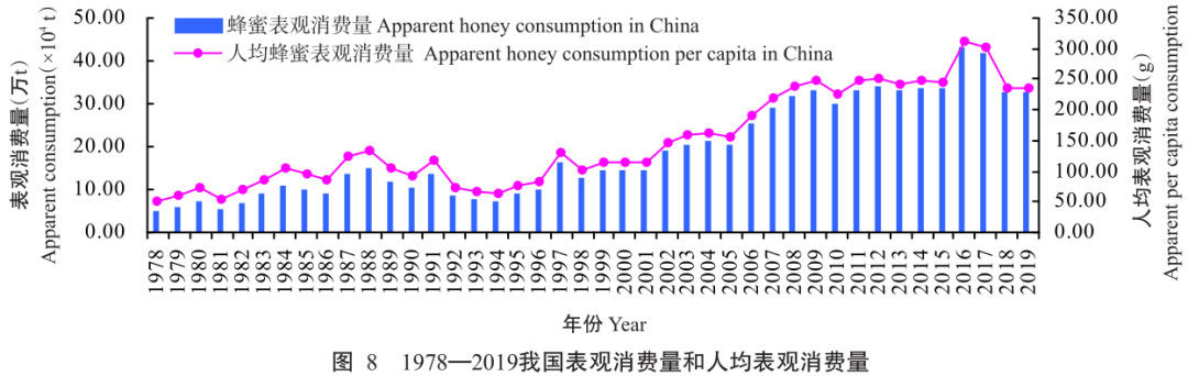 我國蜂蜜進(jìn)口量在我國蜂蜜消費(fèi)中所占比例較低,蜂蜜表觀消費(fèi)水平主要由當(dāng)年蜂蜜產(chǎn)量和當(dāng)年蜂蜜出口量決定。由于我國蜂蜜產(chǎn)量相對較低,出口量波動性較大,2000年之前蜂蜜表觀消費(fèi)量和人均表觀消費(fèi)量波動性均較大,但變化趨勢基本一致;2001—2009年蜂蜜產(chǎn)量迅速上升,出口量較為穩(wěn)定,蜂蜜表觀消費(fèi)量和人均表觀消費(fèi)量總體呈快速上升趨勢;2009年之后,除2016和2017年蜂蜜大豐收使得蜂蜜表觀消費(fèi)量和人均表觀消費(fèi)量有所上升以外,我國蜂蜜產(chǎn)量和出口量一直處于相對穩(wěn)定的狀態(tài)。2008年之后,我國蜂蜜表觀消費(fèi)量一直在30萬噸以上,但由于我國人口基數(shù)大,人均蜂蜜表觀消費(fèi)量相對較低,基本維持在240 g左右,與發(fā)達(dá)國家相比,我國人均蜂蜜表觀消費(fèi)量還存在很大差距;另外,我國直接消費(fèi)天然蜂蜜的消費(fèi)者占少數(shù),需要我國蜂蜜企業(yè)積極宣傳和正確引導(dǎo),確保蜂蜜質(zhì)量,增加消費(fèi)者信任度,提高蜂蜜消費(fèi)量和擴(kuò)大蜂蜜消費(fèi)人群。