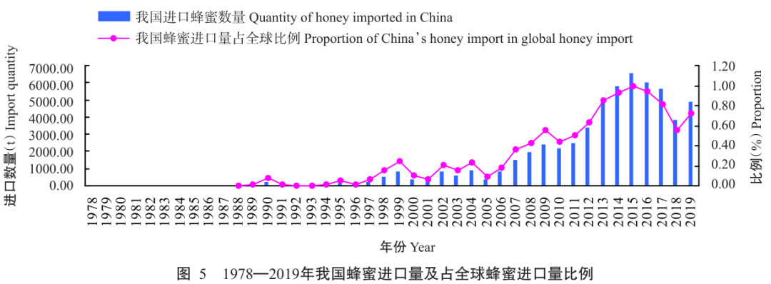 我國從1988年開始從國外進(jìn)口蜂蜜, 1988—2006年我國進(jìn)口蜂蜜很少,每年進(jìn)口蜂蜜數(shù)量低于1000.00 噸,且數(shù)量不穩(wěn)定,波動性較大;除2010年出現(xiàn)輕微波動外,2007—2015年整體增長迅速,2015—2018年又迅速下降,呈拋物狀變化趨勢,2019年又有所增長。我國蜂蜜進(jìn)口量占全球蜂蜜進(jìn)口量比例變化規(guī)律與我國蜂蜜進(jìn)口量的占比相似,所占比例極低,最高為2015年的0.99%,可見我國蜂蜜消費(fèi)主要來源于國內(nèi)蜂蜜市場,進(jìn)口蜂蜜主要是在高端市場,消費(fèi)群體有限,進(jìn)口數(shù)量較少。