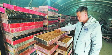 近日,記者走進(jìn)山東省菏澤市牡丹區(qū)皇鎮(zhèn)街道劉莊村村民劉建民的養(yǎng)殖棚內(nèi),一排排生產(chǎn)架上養(yǎng)殖箱整齊碼放著,通體金黃、晶瑩透亮的金黃色小蟲(chóng)在麩皮里上下翻爬,沙沙作響。劉建民