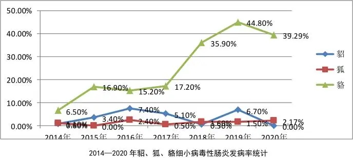 貉細小病毒性腸炎是由細小病毒引起的一種急性、烈性、接觸性病毒性傳染病,臨床以劇烈腹瀉、嘔吐、高發(fā)病率和死亡率為特征。對2014年-2020年貂、狐、貉細小病毒性腸炎各年份動物發(fā)病率進行統(tǒng)計和比較,結果發(fā)現(xiàn)水貂和狐貍細小病毒發(fā)病率在低位徘徊,貉細小病毒性腸炎不但發(fā)病率高而且2014-2020年呈明顯上升趨勢,2019年占來診貉病例的44.8%(2014-2020年貂、狐、貉細小病毒性腸炎發(fā)病率統(tǒng)計如下圖所示),給養(yǎng)殖戶帶來了巨大的損失。筆者就2021年6月份河北某貉子養(yǎng)殖場晚窩貉子因注射細小病毒性腸炎疫苗過晚而打到潛伏期后貉子的病程發(fā)展和綜合治療方案敘述如下僅供參考