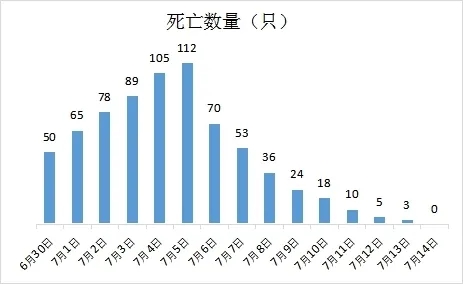 該養(yǎng)殖場夏季貉子存欄5000只,分兩批次完成夏季貉子的防疫工作,6月3日-6月5日免疫2300只早窩貉子,6月27-6月28日免疫2700只晚窩貉子。打完疫苗后的第二天晚窩貉子開始出現(xiàn)精神沉郁、采食量下降、死亡的病例,病情一直延續(xù)到15天后開始出現(xiàn)穩(wěn)定,發(fā)生病情15天內貉子的死亡數(shù)量如下圖所示: