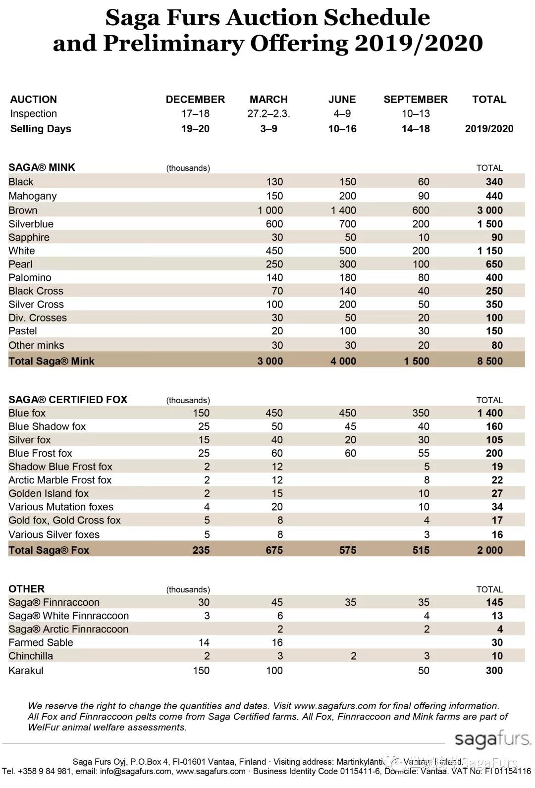 The offering includes a total of 8.5 million Saga Furs superior mink, 2 million high quality fox skins of the widest variety in the world, and 500 000 other types including Finnraccoon and Karakul.