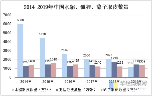 通常應(yīng)用的毛皮有羊、兔、狗等,比較名貴的有狐貍、貉子、水貂毛皮等,常用做大衣、帽子、圍巾的材料,比較厚重的毛皮如熊、狼的毛皮一般作為褥子、掛毯等材料。2019年中國(guó)水貂、狐貍、貉子取皮數(shù)量分別為1169萬(wàn)張、1443萬(wàn)張、1359萬(wàn)張。