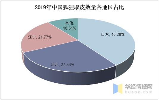 中國(guó)水貂、狐貍、貉子主要的養(yǎng)殖區(qū)位山東、遼寧、黑龍江、河北等地。根據(jù)數(shù)據(jù)顯示,山東是水貂的主要養(yǎng)殖區(qū),2019年山東水貂取皮數(shù)量占全國(guó)水貂取皮數(shù)量的56.79%;其次為遼寧和黑龍江,水貂取皮數(shù)量分別占據(jù)總?cè)∑?shù)量的26.51%、9.82%。