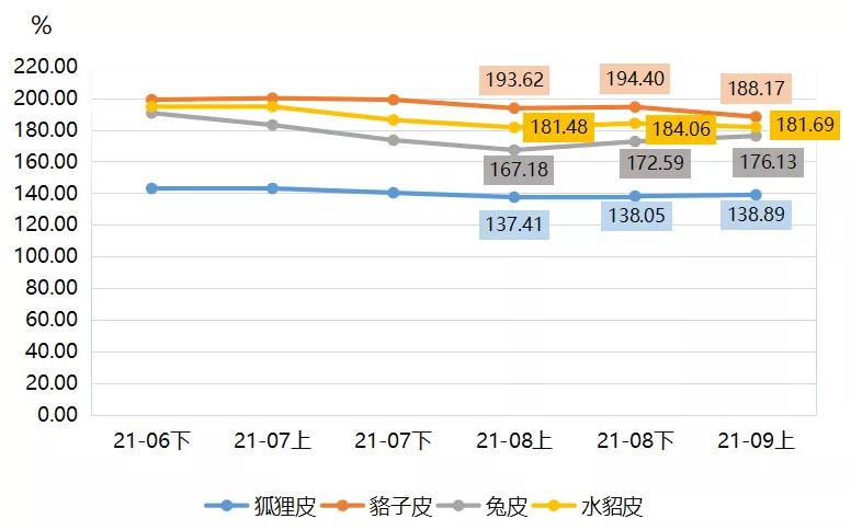 裘皮各品類產(chǎn)品價(jià)格指數(shù)中,狐貍皮和兔皮產(chǎn)品價(jià)格指數(shù)均保持上漲態(tài)勢(shì),9月上半月產(chǎn)品價(jià)格指數(shù)分別收?qǐng)?bào)138.89點(diǎn)和176.13點(diǎn),環(huán)比漲幅分別為0.61%和2.05%。貉子皮和水貂皮產(chǎn)品價(jià)格指數(shù)則有所下滑,9月上半月分別收?qǐng)?bào)188.17點(diǎn)和181.69點(diǎn),環(huán)比分別下滑3.20%和1.29%。
