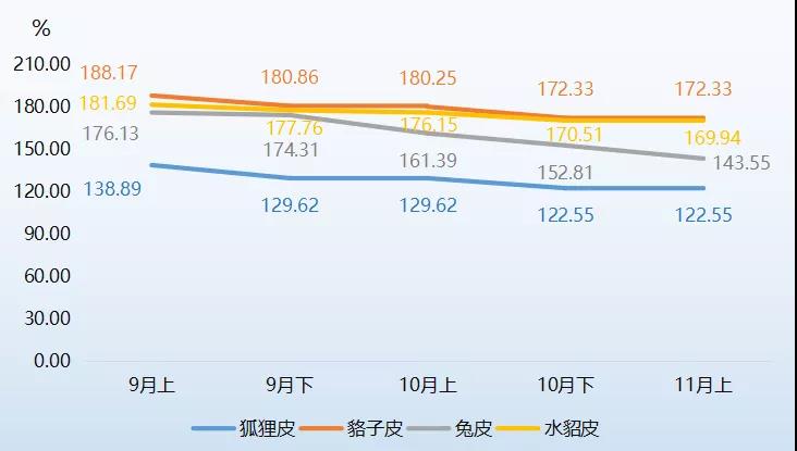 裘皮各品類產(chǎn)品價格指數(shù)中,兔皮和水貂皮產(chǎn)品價格指數(shù)均有所下滑,其中兔皮產(chǎn)品價格指數(shù)下跌幅度較大,11月上半月收報143.55點(diǎn),環(huán)比跌幅為6.06%,是裘皮產(chǎn)品價格指數(shù)下滑的主要原因,導(dǎo)致裘皮產(chǎn)品價格指數(shù)下滑2.78個百分點(diǎn)。水貂皮產(chǎn)品價格指數(shù)11月上半月小幅下滑收報169.94點(diǎn),跌幅為0.33%,環(huán)比跌幅有所收窄。狐貍皮和貉子皮產(chǎn)品價格指數(shù)運(yùn)行穩(wěn)定,11月上半月分別收報122.55點(diǎn)和172.33點(diǎn),與上期持平,其中值得注意的是,貉子皮產(chǎn)品價格指數(shù)近期首次出現(xiàn)止跌態(tài)勢,表明市場行情出現(xiàn)好轉(zhuǎn)跡象。