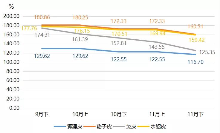 裘皮各品類產(chǎn)品價(jià)格指數(shù)中,兔皮產(chǎn)品價(jià)格指數(shù)下跌幅度最大,11月下半月收?qǐng)?bào)125.35點(diǎn),環(huán)比跌幅為12.68%,是裘皮產(chǎn)品價(jià)格總指數(shù)下滑的主要原因,導(dǎo)致裘皮產(chǎn)品價(jià)格總指數(shù)下滑5.46個(gè)百分點(diǎn)。貉子皮和水貂皮產(chǎn)品價(jià)格指數(shù)均有所下跌,11月分別收?qǐng)?bào)160.51點(diǎn)和159.42點(diǎn),環(huán)比分別下滑6.86%和6.19%。狐貍皮產(chǎn)品價(jià)格指數(shù)跌幅相對(duì)較小,11月下半月價(jià)格指數(shù)小幅下滑收?qǐng)?bào)116.70點(diǎn),跌幅為4.77%。