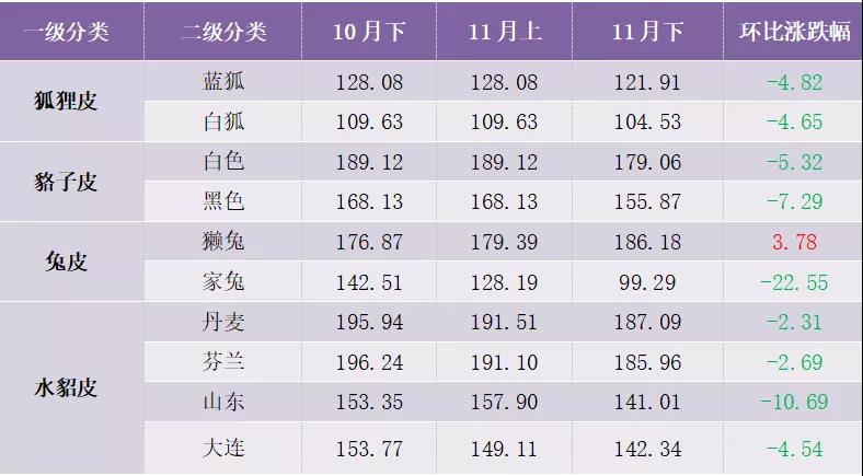 11月下半月,裘皮產(chǎn)品價(jià)格總指數(shù)持續(xù)下滑