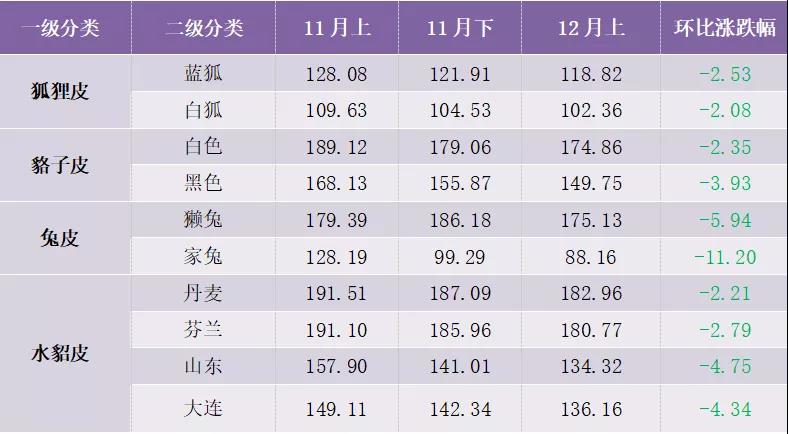 12月上半月,裘皮產(chǎn)品價格指數(shù)延續(xù)下滑態(tài)勢