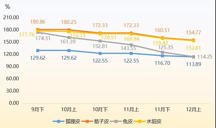 裘皮各品類產(chǎn)品價格指數(shù)中,兔皮產(chǎn)品價格指數(shù)下跌幅度最大,12月上半月收報114.25點,環(huán)比跌幅為8.86%,是裘皮產(chǎn)品價格總指數(shù)下滑的主要原因。貉子皮和水貂皮產(chǎn)品價格指數(shù)均延續(xù)下滑態(tài)勢,12月上半月分別收報154.77點和153.61點,環(huán)比分別下滑3.58%和3.64%。狐貍皮產(chǎn)品價格指數(shù)跌幅相對較小,12月上半月價格指數(shù)小幅下滑收報113.89點,跌幅為2.41%。