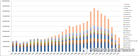 從圖2可以看出,1991—2019年,丹麥的水貂養(yǎng)殖量平均在1 500萬只以上,最高峰達(dá)到2 000萬只以上。2019年以后,養(yǎng)殖量大幅下降。自20世紀(jì)90年代,中國的水貂養(yǎng)殖量得到迅猛發(fā)展,年養(yǎng)殖數(shù)量都在1 000萬只以上。從水貂皮的總貿(mào)易量來看,中國和丹麥生產(chǎn)的水貂皮張產(chǎn)量約占全世界皮張產(chǎn)量的50%~60%。2019年以后,受新冠肺炎疫情影響,全球水貂養(yǎng)殖量呈迅速下降的趨勢。由于新冠肺炎疫情,關(guān)停的國家有德國、阿根廷、荷蘭和丹麥等,其他中歐國家比如波蘭、希臘、立陶宛和烏克蘭等的養(yǎng)殖量沒有減少,而且還有增長的趨勢。