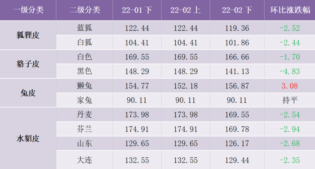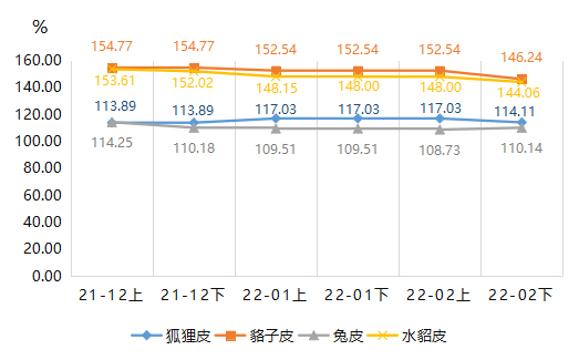 2022年2月下半月,分品類(lèi)產(chǎn)品價(jià)格指數(shù)漲跌各異,其中貉子皮產(chǎn)品價(jià)格指數(shù)下跌較大,2月價(jià)格指數(shù)收?qǐng)?bào)146.24點(diǎn),環(huán)比下滑4.13%。狐貍皮產(chǎn)品價(jià)格指數(shù)近三個(gè)月首次出現(xiàn)下跌,2月下半月指數(shù)收?qǐng)?bào)114.11點(diǎn),環(huán)比跌幅為2.50%。水貂皮產(chǎn)品價(jià)格指數(shù)2月下半月收?qǐng)?bào)144.06點(diǎn),相比上期下滑2.66%。兔皮產(chǎn)品價(jià)格指數(shù)則有上漲,2月下半月收?qǐng)?bào)110.14點(diǎn),環(huán)比漲幅為1.30%。2022年2月下半月,裘皮各品類(lèi)細(xì)分產(chǎn)品價(jià)格指數(shù)中,除獺兔皮產(chǎn)品價(jià)格指數(shù)外普遍下跌。具體價(jià)格指數(shù)運(yùn)行情況如表所示: