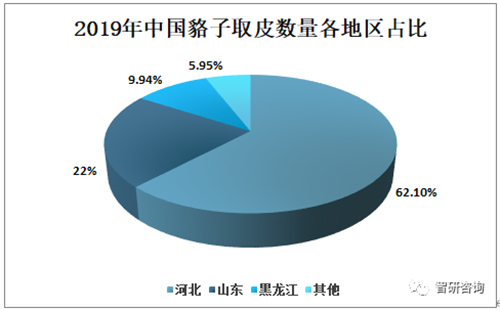 2019年河北貉子取皮數(shù)量占全國(guó)貉子取皮數(shù)量的62.10%,山東及黑龍江貉子取皮數(shù)量占全國(guó)貉子取皮數(shù)量的比重分別為22%、9.94%。
