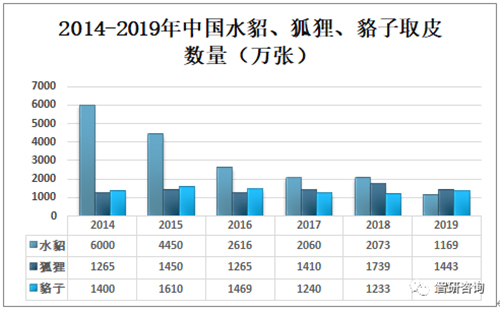 通常應(yīng)用的毛皮有羊、兔、狗等,比較名貴的有狐貍、貉子、水貂毛皮等,常用做大衣、帽子、圍巾的材料,比較厚重的毛皮如熊、狼的毛皮一般作為褥子、掛毯等材料。2019年中國(guó)水貂、狐貍、貉子取皮數(shù)量分別為1169萬(wàn)張、1443萬(wàn)張、1359萬(wàn)張。