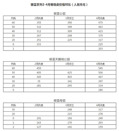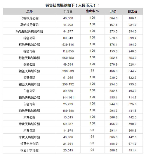 為期7天的丹麥四月線上拍賣會結(jié)束了,水貂皮的售出量近280萬張,整體價(jià)格全面上漲,上漲幅度請對比2-4月份價(jià)格。