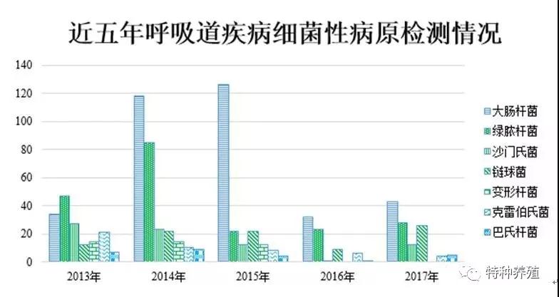 2013~2017年,水貂細(xì)菌性肺炎的主要病原以大腸桿菌、綠膿桿菌、鏈球菌、克雷伯氏菌、巴氏桿菌等條件性致病菌為主。