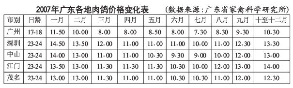 2007年廣東各地肉鴿價格變化表 (數據來源:廣東省家禽科學研究所)