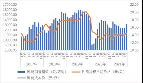 8月份,監(jiān)測企業(yè)乳鴿銷售指數(shù)為13150,環(huán)比增加6.15%,為2月份以來的最大增幅。本期波動指數(shù)為0.76,仍屬于一般波動。同比看,乳鴿銷售指數(shù)基本處在正常年份的水平。價格方面,本期銷售價格為14.40元/只,環(huán)比增加0.3%,基本持平;但其成本價格又有所增加,達(dá)到14.29元/只,因此,從監(jiān)測企業(yè)看,乳鴿盈利情況不容樂觀。另外,結(jié)構(gòu)方面,有的企業(yè)乳鴿價格仍在下調(diào),最大下調(diào)4%;本期乳鴿價格最高、最低值與上期相等,分別為21元/只和9元/只。