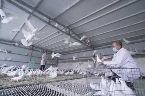 近日,在新疆巴音郭楞蒙古自治州和靜縣額勒再特烏魯鄉(xiāng)察汗烏蘇村,肉鴿養(yǎng)殖繁育基地的工作人員正在標(biāo)準(zhǔn)化養(yǎng)殖圈舍內(nèi)忙碌。該養(yǎng)殖場已孵化出今年第一批鴿苗共3000羽,預(yù)計4月