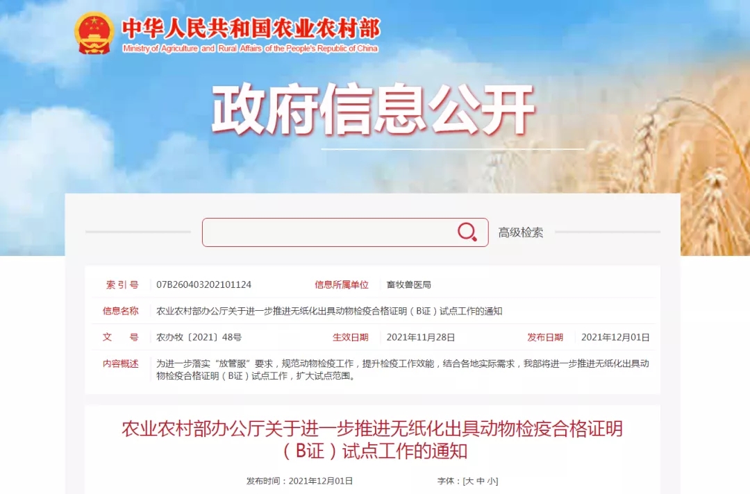 農(nóng)業(yè)農(nóng)村部關于進一步推進無紙化出具動物檢疫合格證明(B證)試點工作的通知