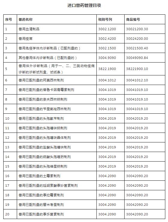 獸藥進(jìn)口單位進(jìn)口獸藥時(shí),應(yīng)向農(nóng)業(yè)農(nóng)村部或省級人民政府畜牧獸醫(yī)主管部門申請《進(jìn)口獸藥通關(guān)單》。進(jìn)口單位憑《進(jìn)口獸藥通關(guān)單》向海關(guān)辦理進(jìn)口手續(xù)。特此公告。 附件:進(jìn)口獸藥管理目錄