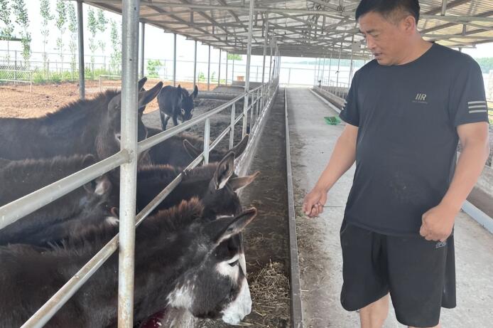 (樓下村黨支部書記王海流正在查看毛驢生長情況)