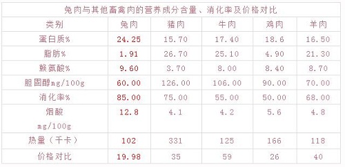 兔肉肌纖維鮮嫩細(xì)膩,易于消化吸收,更適宜老年人、兒童、胃口失調(diào)者以及消化功能弱者食用。從上可以看出,兔肉比牛肉、雞肉、羊肉、豬肉營養(yǎng)高,但價格沒有牛、羊、豬肉高。