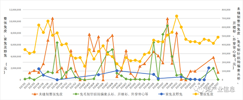 7月份整張兔皮進(jìn)口額為728.13萬(wàn)元,較上月上升16.70%(圖7);未縫制整張兔皮進(jìn)口額為8.65萬(wàn)元,較上月下降65.99%;兔毛制針織鉤編套頭衫、開襟衫、外穿背心等進(jìn)口額為0.30萬(wàn)元,較上月下降97.70%。