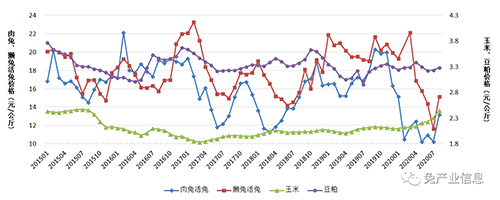 圖8 2015年1月以來(lái)活兔收購(gòu)價(jià)格及飼料價(jià)格