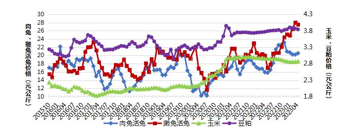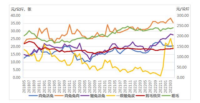 圖2 2018年5月-2023年4月兔及兔產(chǎn)品價格走勢(右坐標為兔毛價格)
