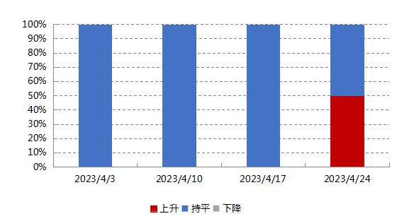 2.與2023年3月份相比,2023年4月份四周的銷售情況在第四周有所上升,其余三周基本保持持平;總體上商戶對市場的未來走勢持中性態(tài)度。