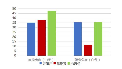 4月份養(yǎng)殖戶的肉兔兔肉銷售價格、中間商的集散價格和超市的零售價格分別為:35.33元/公斤、38.00元/公斤、47.50元/公斤。中間商的集散價格略高于產(chǎn)地的養(yǎng)殖戶銷售價格,低于零售端超市的肉兔兔肉價格。4月份集散地肉兔兔肉價格比養(yǎng)殖戶銷售的兔肉價格高7.55%,超市消費價格比集散地的兔肉價格高25.00%,比養(yǎng)殖戶銷售的兔肉價格高34.44%。養(yǎng)殖戶的獺兔兔肉銷售價格、中間商的集散價格和超市的零售價格分別為35.50元/公斤、11.85元/公斤、35.56元/公斤。集散地獺兔兔肉價格比養(yǎng)殖戶銷售的兔肉價格低66.62%,零售端超市的獺兔兔肉價格比養(yǎng)殖戶銷售的兔肉價格高0.18%。