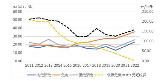 圖1 2011年—2022年兔及兔產(chǎn)品平均價格走勢 (右坐標為兔毛價格)